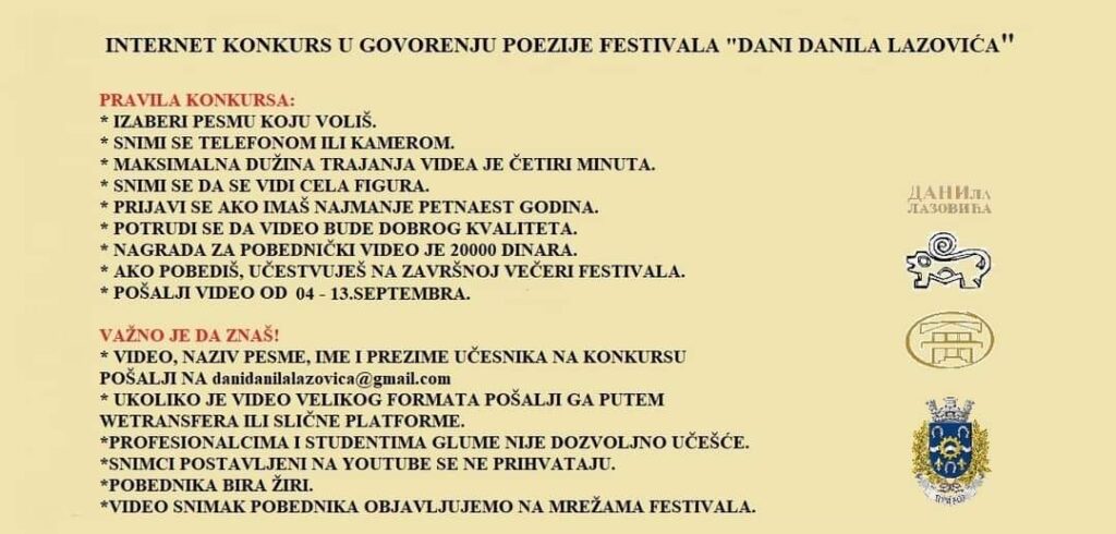 Фестивал Дани Данила Лазовића расписао је интернет конкурс у говорењу поезије, а право учешћа имају све особе које имају више од петнаест година. Победника конкурса очекује награда од 20000 динара, као и учешће на завршном програму фестивала 21. септембра.